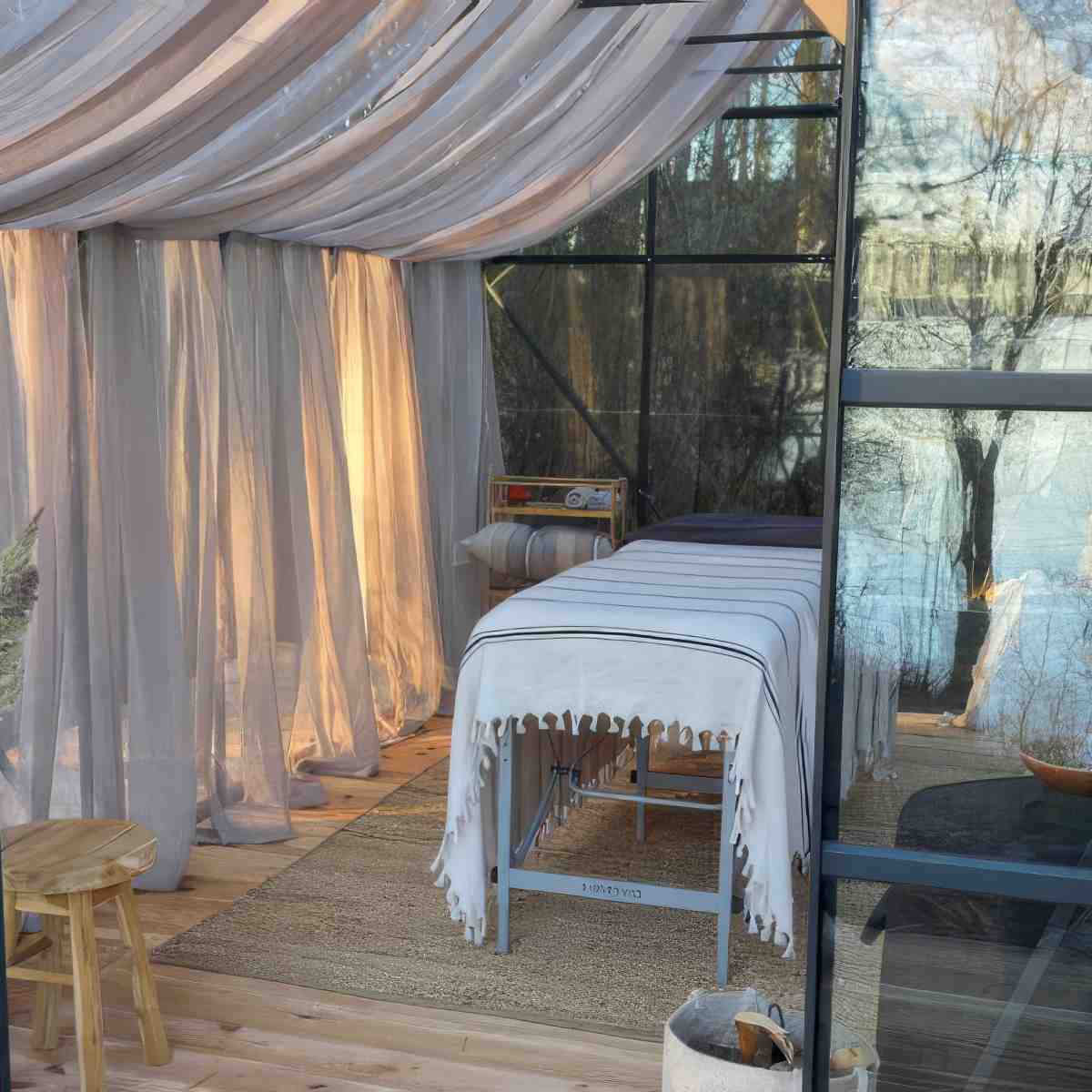 Masaż wykonywany w miejscu wskazanym przez klienta i zależny jest od pogody: domek z widokiem na las (cały rok), szklarnia (sezon wiosna-jesień), pomost (sezon letni).